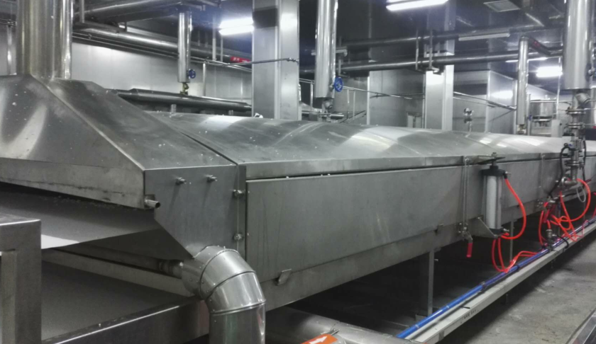 布好漿的網(wǎng)帶自動(dòng)進(jìn)入蒸粉機,將米漿蒸熟成米粉片,熟化效果好;